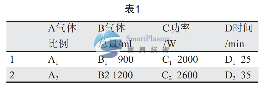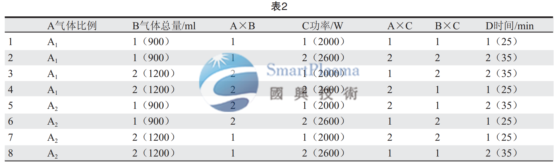 为得到最佳凹蚀效果,选择等离子凹蚀试验的因素,包括功率、气体总量、气体比例、凹蚀时间,但本次试验不选择温度,原因是根据资料信息和笔者以往的试验经验,凹蚀处理对温度要求不高,因此只需要将试验温度控制在正常范围之内即可。需要说明的是,为了便于考察因素之间的交互作用,每个试验因素都选择两个试验水平,这样简单明了,而且各试验因素水平都是在对以往的实验结果和资料信息的综合分析之后才加以选择的,具有整齐可比,均匀分散的特点。因素水平的选择如表1,至于两种气体(四氟化碳和氧气)的比例是笔者以往凹蚀最佳实验效果的参数,在此仅用A1与A2表示(表1)。