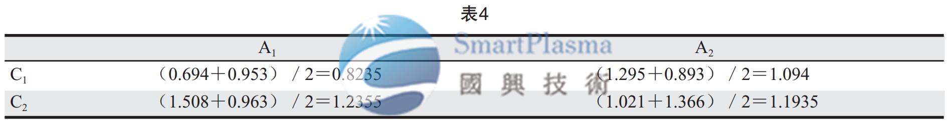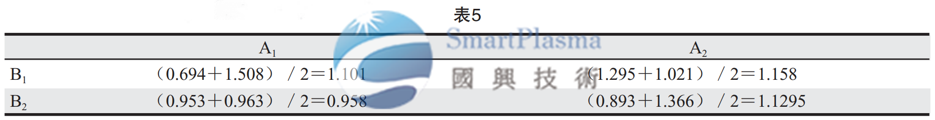 验。以表2来安排8组试验,所测试的试验结果即凹蚀量用质量差来表示,具体做法是对比单面覆铜板在试验前后的质量差(用电子天平分析测量),该质量差代表着等离子体对PI的凹蚀效果,以此为标准,做8次试验得到8组数据,为了科学分析各因素及交互作用对实验结果的影响,还要对各因素和交互作用进行极差分析,并以此判断那些因素对实验结果的影响大,那些因素对试验结果影响小,同时还可以判断对实验结果影响大的因素取那个水平将对实验结果更加有利。