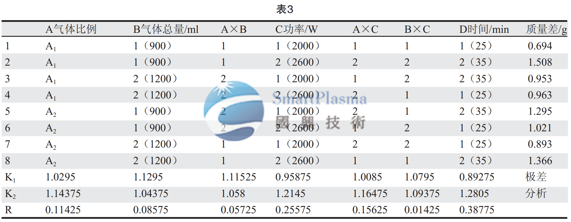验。以表2来安排8组试验,所测试的试验结果即凹蚀量用质量差来表示,具体做法是对比单面覆铜板在试验前后的质量差(用电子天平分析测量),该质量差代表着等离子体对PI的凹蚀效果,以此为标准,做8次试验得到8组数据,为了科学分析各因素及交互作用对实验结果的影响,还要对各因素和交互作用进行极差分析,并以此判断那些因素对实验结果的影响大,那些因素对试验结果影响小,同时还可以判断对实验结果影响大的因素取那个水平将对实验结果更加有利。